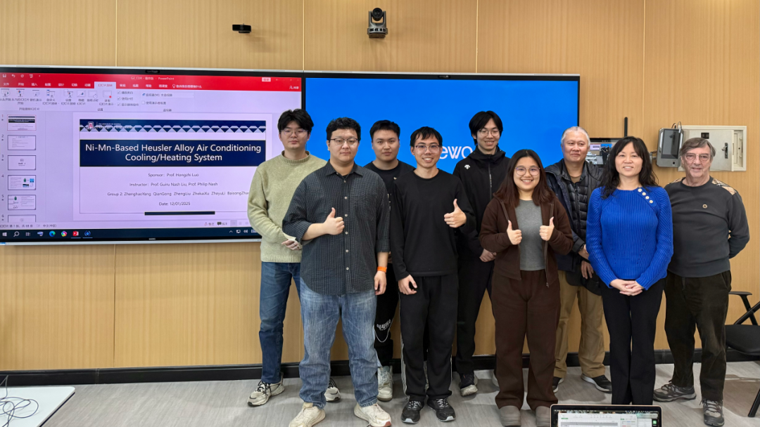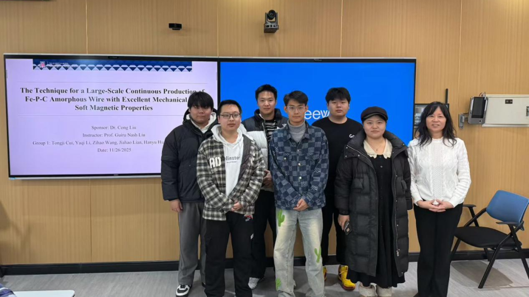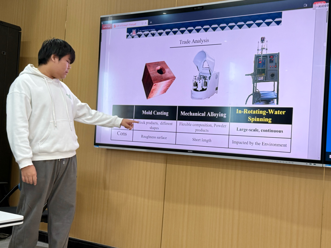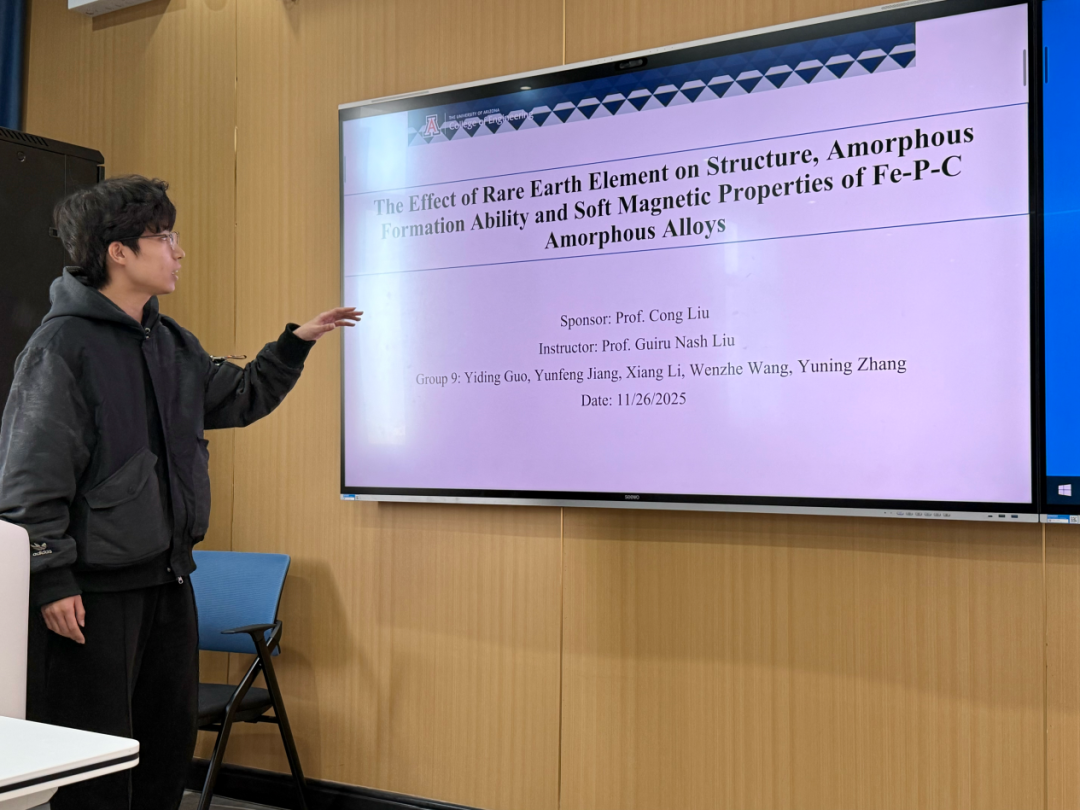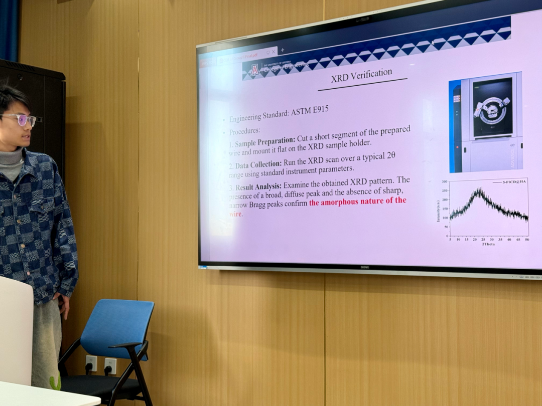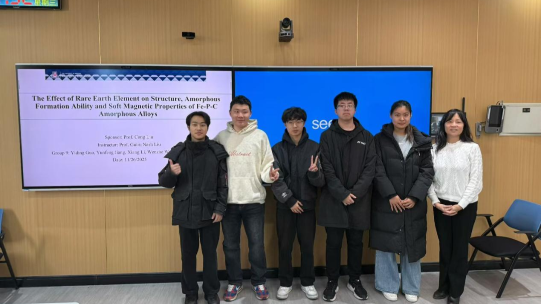在材料物理专业本次跨学科设计A毕业设计实践中,亚利桑那大学Guiru Nash Liu教授、Philip Nash教授与罗鸿志、陶俊光、阎文博、李薇薇、刘方舟、刘丛这些校内导师组成国际化-交叉化联合指导矩阵。值得一提的是,10组课题中有9组由导师结合各自学术难题定向抛出,第6组“基于位错密度的忆阻器可靠性预测软件”则由学生自主阅读数篇文献后独立命题——该器件被视为模拟大脑突触的核心元件。其余课题同样锋芒毕露:第2组“镍锰基赫斯勒合金空调制冷/制热系统”成功构建固态制冷原型,正准备申请国家发明专利;第8组“电极界面处电化学析氢的微尺度离子动力学模拟”构建低能耗光电催化体系实现高效水分解制氢,为下一代清洁能源提供新路线;第1组“发展高强度与优异软磁性能Fe-P-C非晶线材大规模连续化生产的工艺”与第9组“研究稀土元素对Fe-P-C非晶合金的结构、非晶形成能力和软磁性能产生的影响”形成非晶合金“工艺—性能”闭环;第3组“钠离子电池中煤基硬碳阳极的研究”为低成本储能提供碳素解决方案;第4组“单光子探测系统”突破极限弱光探测瓶颈;第5组“提高钙钛矿太阳能电池效率的研究”瞄准新一代光伏技术;第7组“探究FEP薄膜表面电位的时空演变规律”揭示介电薄膜电荷演化机制;第10组“基于光伏电荷打印的水性微流体机器人”将光伏电荷打印与微流体操控融合,形成“材料—能量—信息—生命”全链条交叉格局。