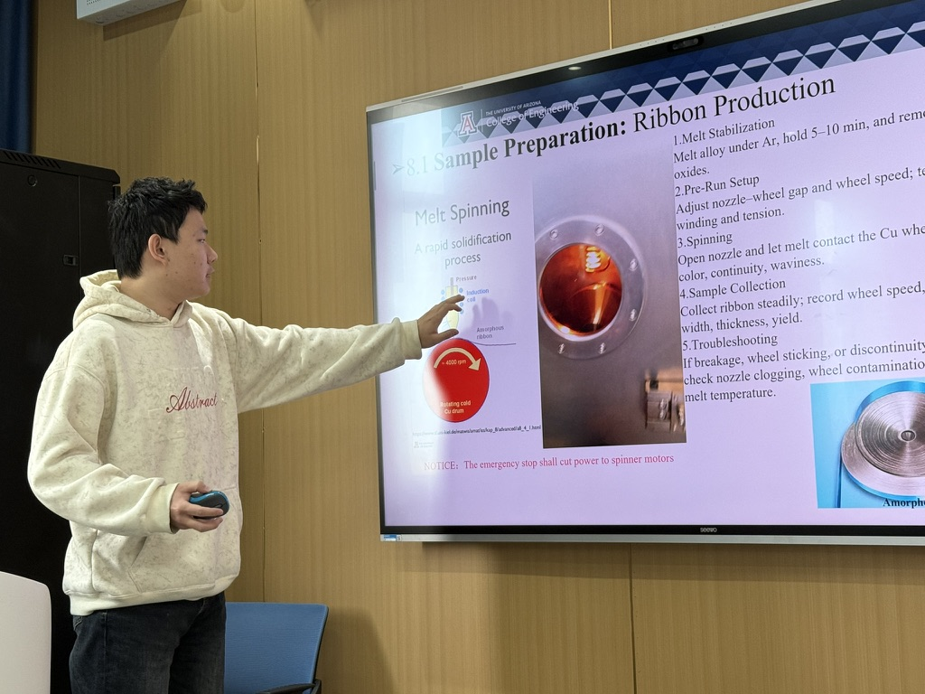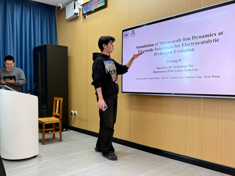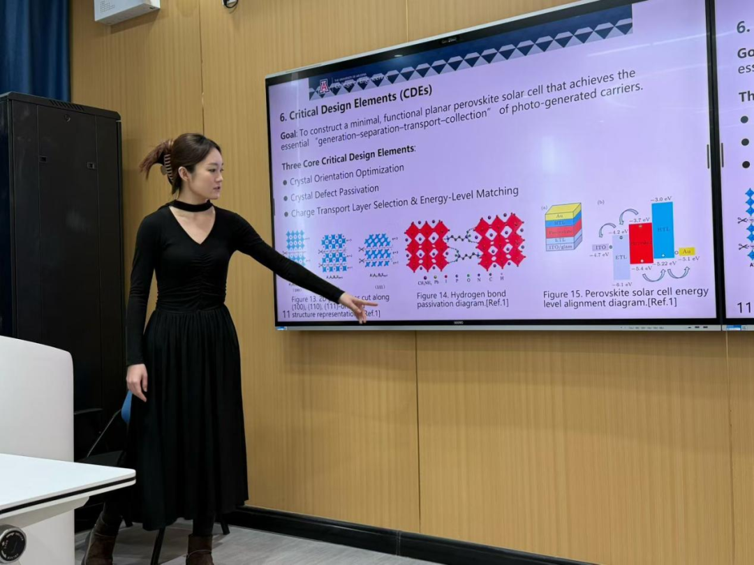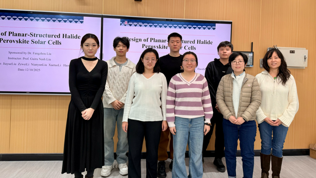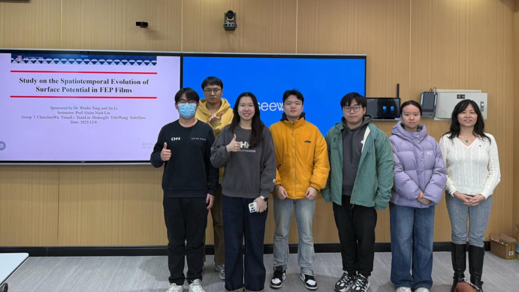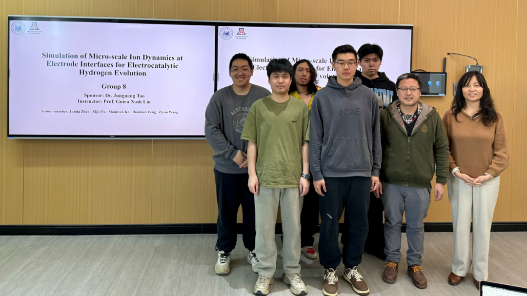 在材料物理专业本次跨学科设计A毕业设计实践中,亚利桑那大学Guiru Nash Liu教授、Philip Nash教授与罗鸿志、陶俊光、阎文博、李薇薇、刘方舟、刘丛这些校内导师组成国际化-交叉化联合指导矩阵。值得一提的是,10组课题中有9组由导师结合各自学术难题定向抛出,第6组“基于位错密度的忆阻器可靠性预测软件”则由学生自主阅读数篇文献后独立命题——该器件被视为模拟大脑突触的核心元件。其余课题同样锋芒毕露:第2组“镍锰基赫斯勒合金空调制冷/制热系统”成功构建固态制冷原型,正准备申请国家发明专利;第8组“电极界面处电化学析氢的微尺度离子动力学模拟”构建低能耗光电催化体系实现高效水分解制氢,为下一代清洁能源提供新路线;第1组“发展高强度与优异软磁性能Fe-P-C非晶线材大规模连续化生产的工艺”与第9组“研究稀土元素对Fe-P-C非晶合金的结构、非晶形成能力和软磁性能产生的影响”形成非晶合金“工艺—性能”闭环;第3组“钠离子电池中煤基硬碳阳极的研究”为低成本储能提供碳素解决方案;第4组“单光子探测系统”突破极限弱光探测瓶颈;第5组“提高钙钛矿太阳能电池效率的研究”瞄准新一代光伏技术;第7组“探究FEP薄膜表面电位的时空演变规律”揭示介电薄膜电荷演化机制;第10组“基于光伏电荷打印的水性微流体机器人”将光伏电荷打印与微流体操控融合,形成“材料—能量—信息—生命”全链条交叉格局。