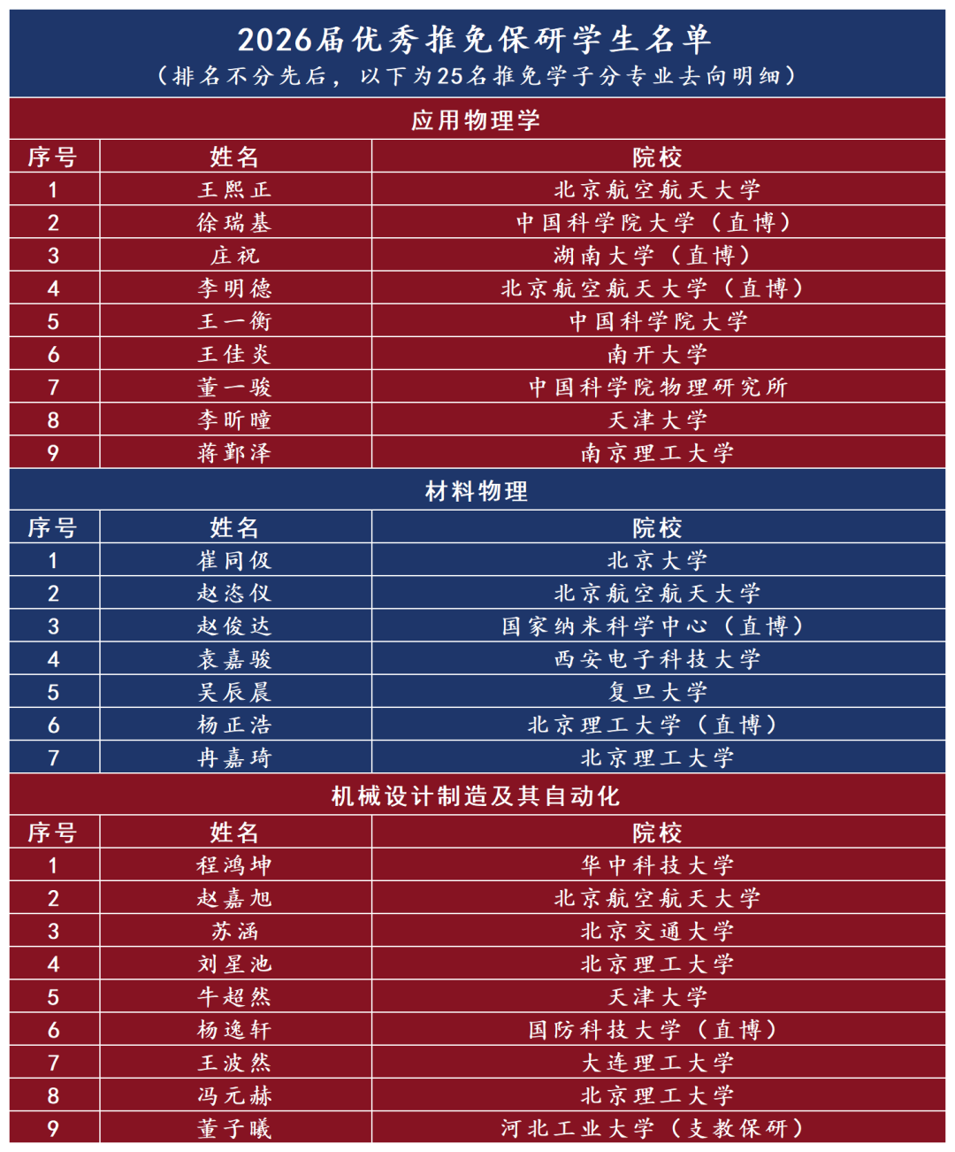 时光凝萃硕果,奋斗终得回响。历经两个多月的分享,学院2026届本科生推免保研系列迎来收官时刻。25名优秀学子凭借工科生独有的严谨务实、创新突破与执着坚守,成功叩开多所国内一流高校及科研机构的大门,用奋斗为青春作答,为学院育人成绩单镌刻下浓墨重彩的一笔。